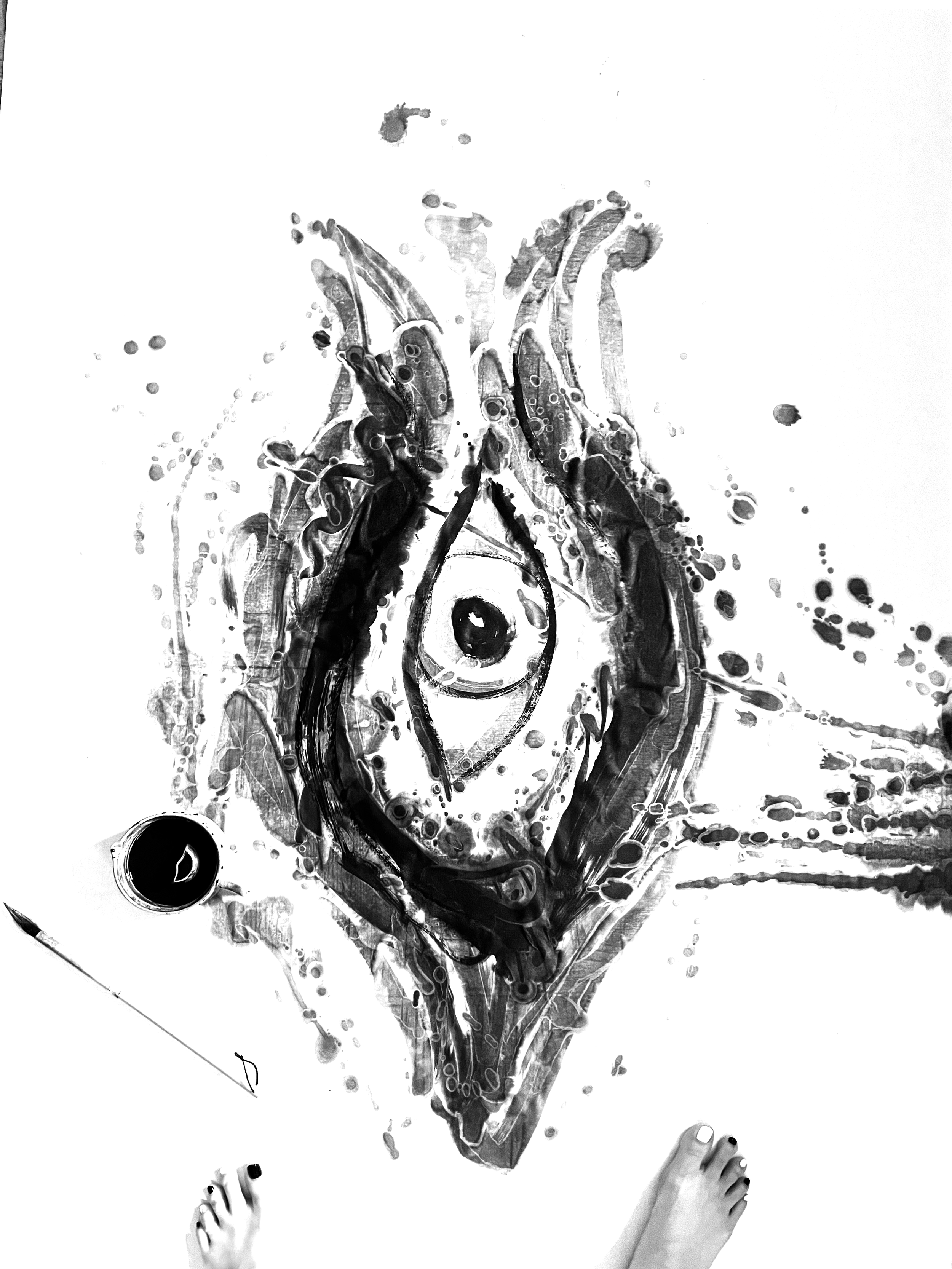 I move with the ink as it flows through my body. The ink bypasses my thinking mind as I walk across reams of rice paper. Ancestral landscapes, visions, memories that are not mine but want to be seen pass through my womb, drip from the brush, yearning to be born on paper.